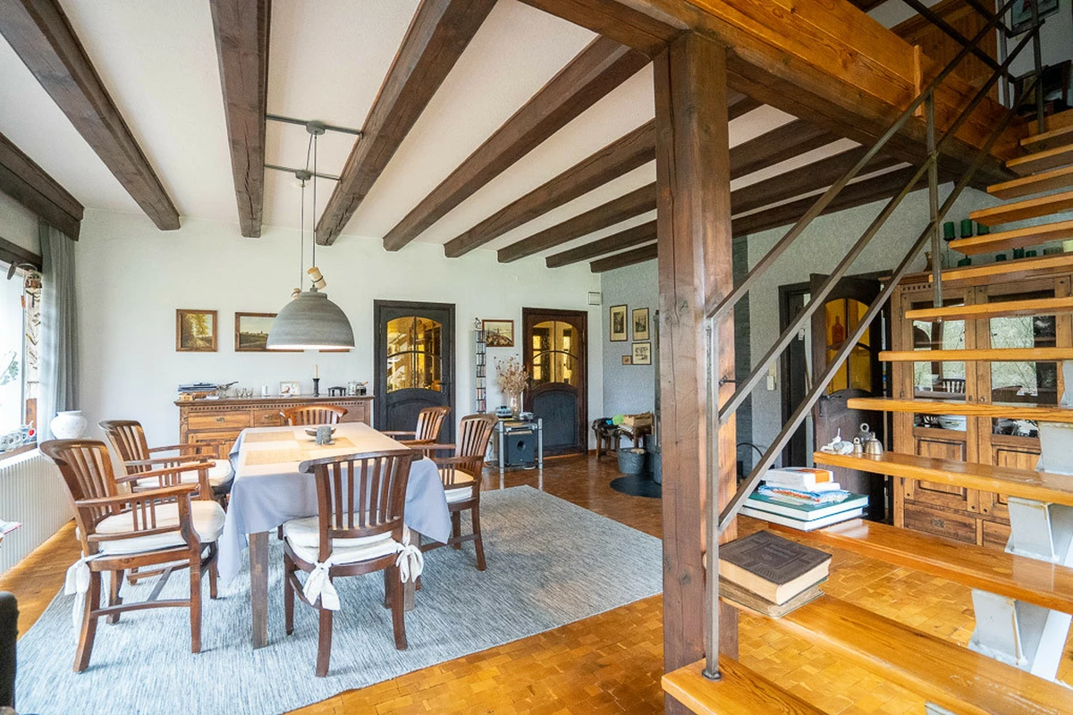 Wohnküche mit Einbauküche und Terrassenzugang 2 Auffahrten => Kopfsteinpflaster HWR, Waschküche, Speisekammer mit Kältekeller Fliesen, Parkett, Teppich Holzfenster 2-fach-verglast Terrasse in süd- und westliche Ausrichtung und Terrasse in östlicher Ausrichtung Treppenlift Garage mit separater Werkstatt Carport