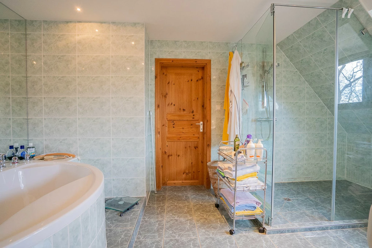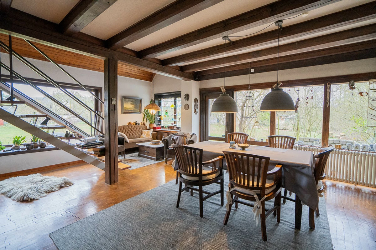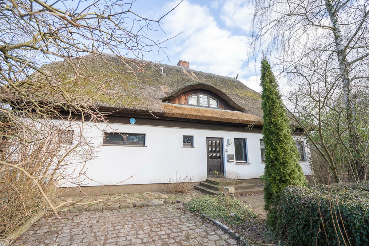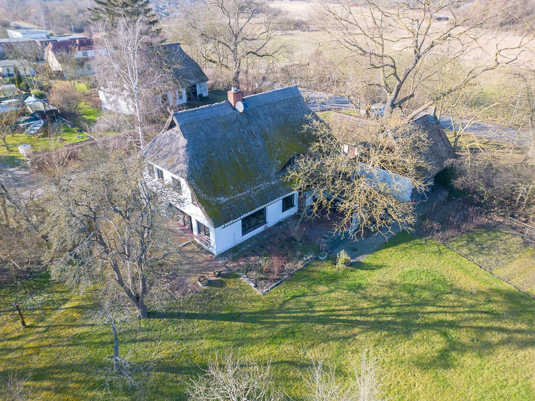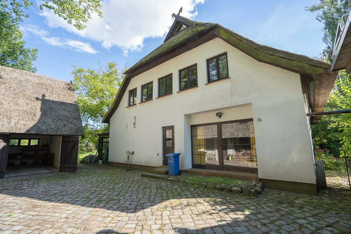 Dieses einzigartige Reetdachhaus aus dem Jahr 1975 eröffnet Ihnen die Chance, Geschichte und modernen Wohnkomfort miteinander zu vereinen. Das Haus wurde in massiver Bauweise (43er Außenwände) errichtet und verfügt über eine großzügige Wohnfläche von ca. 213 m². Über den großen Eingangsbereich betreten Sie dieses außergewöhnliche Einfamilienhaus. Das Erdgeschoss umfasst drei gut geschnittene Zimmer, darunter eine große, gemütliche Wohndiele mit Kaminofen (7,5 kW), ein kleines Wohnzimmer, ein Büro, eine Wohnküche mit Einbauküche und angrenzender großzügiger Speisekammer mit Kühlkeller. Von der Küche und der Wohndiele hat man jeweils einen direkten Zugang zur Terrasse. Außerdem findet man ein Gäste-WC und eine große Werkstatt auf dieser Wohnebene. Das 1. Obergeschoss erreichen Sie über eine massive Holz-Stahltreppe. Hier befinden sich eine offene Galerie mit Bibliothek, drei ruhige und gut geschnittene Schlaf- oder Gästezimmer sowie das Tageslicht-Vollbad und ein Gäste-WC. Der Spitzboden bietet genügend Platz zum Verstauen für Allerlei. Das ca. 1.834 m² große Grundstück ist pflegeleicht angelegt (Naturgarten mit altem Obstbaumbestand) und schafft Platz für Freizeitaktivitäten, Gartenprojekte oder einfach zum Entspannen. Zum Grundstück zugehörig sind zwei Auffahrten, von der einen, erreichet man die Garage mit separater Werkstatt und einen massiv gebauten ehemaligen Hühnerstall. Beide Gebäude sind ebenfalls mit Reet gedeckt. Der Carport ist mit einer Photovoltaik und einer Solarthermie ausgestattet. Die solide Bausubstanz und die einzigartige Atmosphäre des Hauses bilden eine hervorragende Grundlage, um ein besonderes Zuhause für Sie und Ihre Familie zu realisieren.