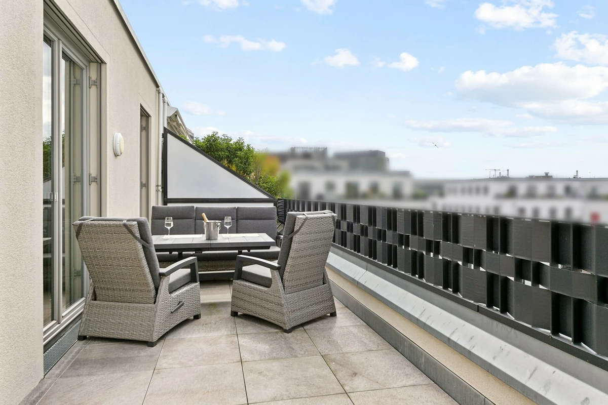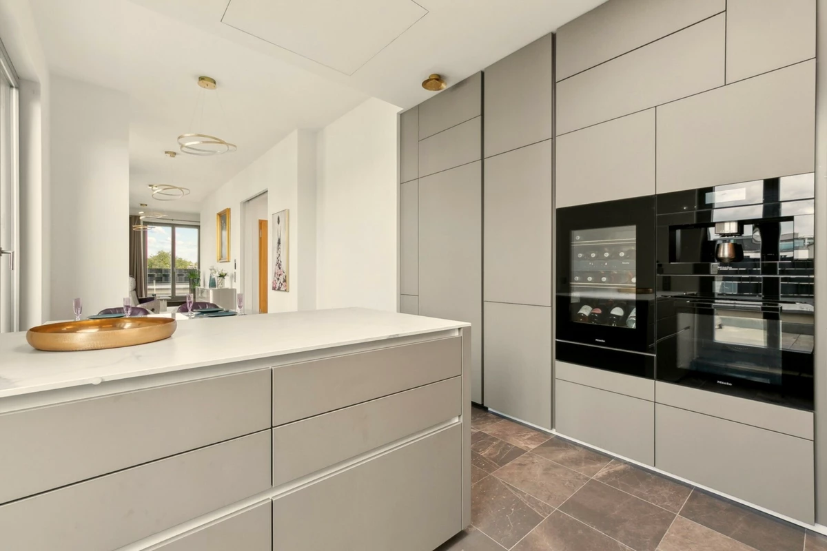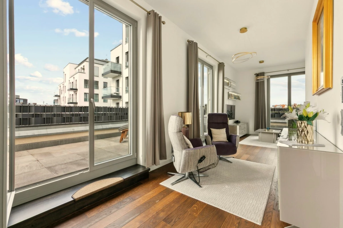 Im hochwertigen Wohnprojekt „Charlottenburg Nr. 1“ befindet sich dieses elegante Penthouse, das mit ca. 134 m² Wohnfläche und einer umlaufenden Dachterrasse exklusiven Wohnkomfort bietet. Die Wohnung ist bequem über den Aufzug mit privatem Zugang erreichbar und überzeugt durch eine durchdachte Raumaufteilung mit insgesamt drei Zimmern. Der offene Wohn- und Essbereich mit Oberlichtern und direktem Zugang zur Terrasse bildet das Zentrum des Lebens. Von hier aus genießen Sie einen wunderschönen Blick auf die Spree, der dieser Immobilie eine besondere Note verleiht. Das Hauptschlafzimmer verfügt über ein elegantes Wannenbad en suite. Ein weiteres Duschbad ergänzt die Ausstattung und unterstreicht die Alltagstauglichkeit. Auch das zweite Schlafzimmer sowie der stilvoll integrierte Arbeitsbereich sind hell gestaltet und bieten direkten Zugang zur umlaufenden Terrasse. Die Ausstattung erfüllt höchste Ansprüche: Verlegt wurde edles Bauwerk-Parkett, während die maßgefertigte Design-Einbauküche im Wert von ca. 70.000 € mit Quooker-Wasserhahn, Weinkühlschrank und integrierter Kaffeemaschine keinerlei Wünsche offenlässt. Moderne Haustechnik mit Busch-Jaeger-Steuerung, Klimaanlage, Fußbodenheizung, Sonnenschutzrollos und LAN-Verkabelung in allen Räumen sorgt für maximalen Komfort. Ein dezent integrierter Hauswirtschaftsraum unterstützt die Alltagstauglichkeit. Besonderes Highlight sind die maßangefertigten Möbel, die individuell für diese Wohnung entworfen wurden und auf Wunsch kostenfrei übernommen werden können. Ergänzt wird die luxuriöse Ausstattung durch eine indirekte Beleuchtung, die insbesondere in den Abendstunden eine außergewöhnliche Atmosphäre schafft. Abgerundet wird das Angebot durch den Concierge-Service des Hauses sowie eine hauseigene Tiefgarage. Dieses Penthouse verbindet eine hervorragende Ausstattung, lichtdurchflutete Architektur und eine der begehrtesten Lagen Charlottenburgs zu einem Zuhause, das gleichermaßen repräsentativ wie wohnlich ist.