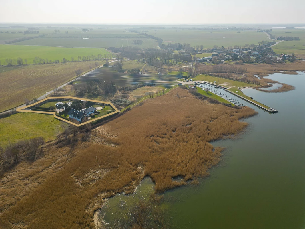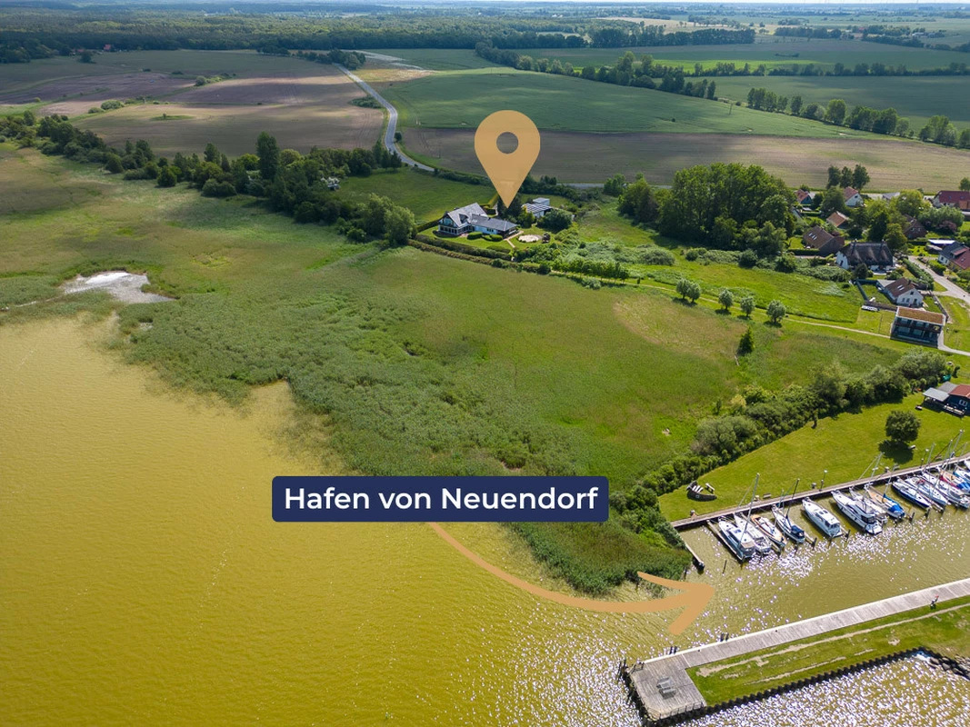 Das Anwesen befindet sich in Neuendorf, einem idyllischen Ortsteil der Gemeinde Saal im Landkreis Vorpommern-Rügen, Mecklenburg-Vorpommern. Eingebettet in die malerische Landschaft der südlichen Boddenküste, liegt Neuendorf direkt am Saaler Bodden, einem Teil der Vorpommerschen Boddenlandschaft. Die Umgebung ist geprägt von weiten Wasserflächen, Wiesen und Wäldern, die zu vielfältigen Freizeitaktivitäten wie Wandern, Radfahren und Wassersport einladen. Eine Bushaltestelle in Neuendorf gewährleistet die Anbindung an den öffentlichen Nahverkehr, insbesondere durch die Buslinie 214 der Verkehrsgesellschaft Vorpommern-Rügen (VVR), die Verbindungen nach Ribnitz-Damgarten und Barth bietet. Die nächstgelegenen Städte Ribnitz-Damgarten und Barth sind in etwa 15 bis 20 Autominuten erreichbar und bieten eine umfassende Infrastruktur mit Einkaufsmöglichkeiten, Schulen, medizinischer Versorgung und kulturellen Angeboten. Die Hansestädte Rostock und Stralsund sind ebenfalls gut erreichbar und laden zu weiteren Ausflügen ein. Die Entfernung zu den Metropolen Berlin und Hamburg beträgt etwa 230 km bzw. 160 km, was einer Fahrzeit von ca. 2,5 bis 3 Stunden entspricht.