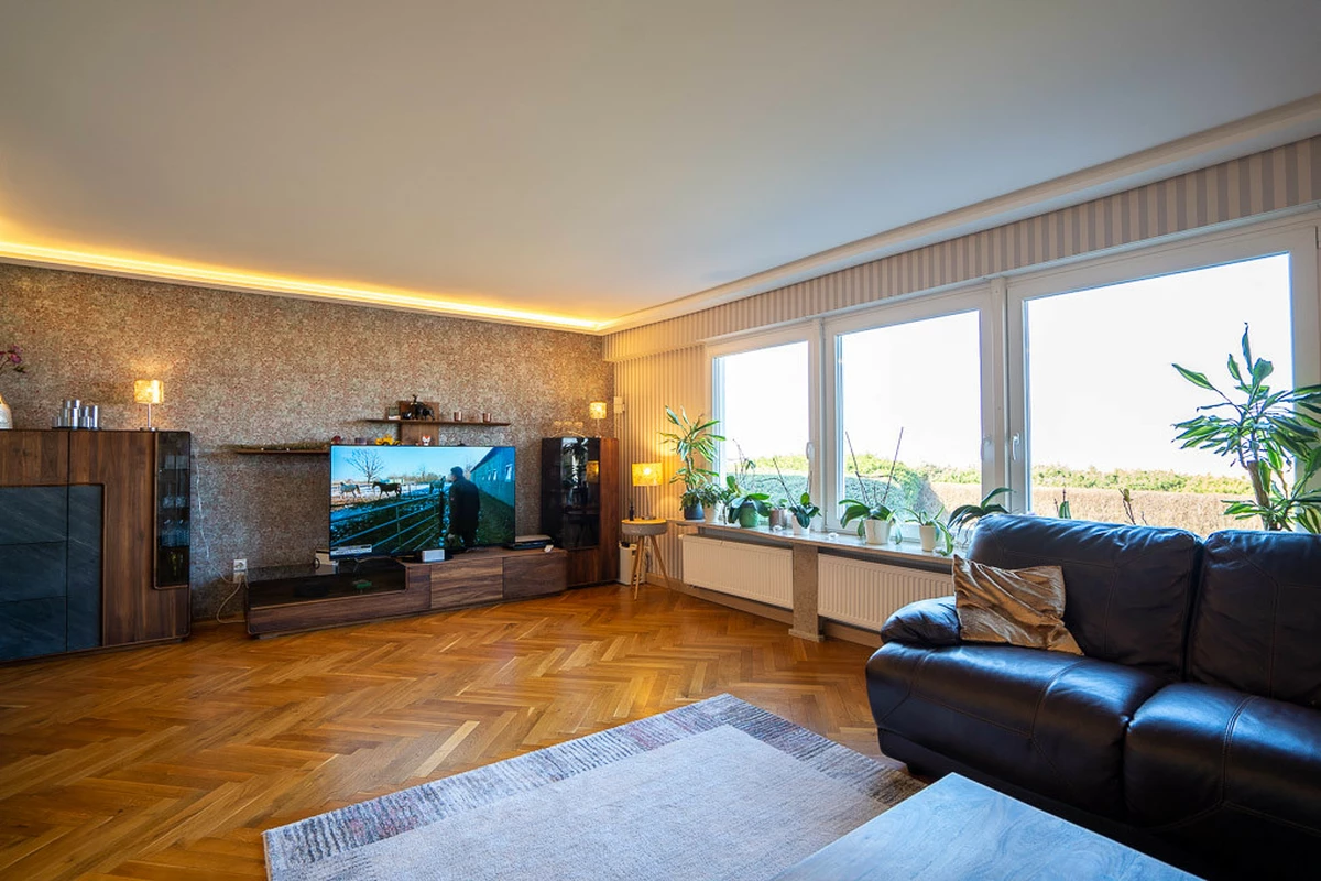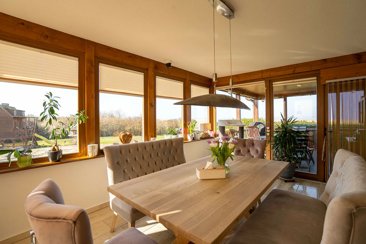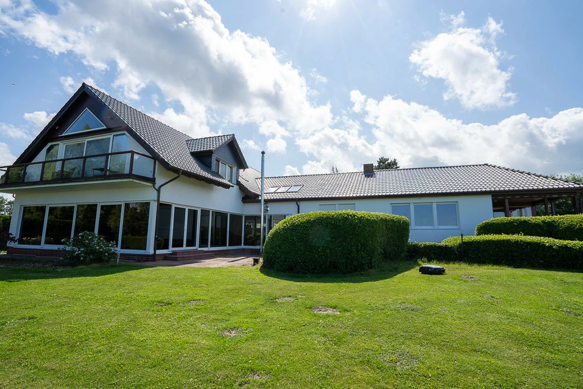 Diese exklusive Villa vereint großzügigen Wohnkomfort, hochwertige Ausstattung und eine einzigartige Lage mit direktem Weitblick auf den Saaler Bodden. Mit einer Wohnfläche von ca. 400 m² auf einem ca. 6.128 m² großen Grundstück bietet das Anwesen ein herausragendes Wohngefühl. Ursprünglich in den 1970er Jahren erbaut, wurde die Immobilie Ende der 1990er Jahre in 1,5-geschossiger Bauweise großzügig erweitert. Das lichtdurchflutete Erdgeschoss des ursprünglichen Gebäudes beeindruckt mit großen Fensterfronten, edlem Fischgrätenparkett im Wohnzimmer und einem traditionellen Kachelofen, der für eine behagliche Atmosphäre sorgt. Hier befinden sich zudem zwei Schlafzimmer, ein Gäste-WC sowie ein Duschbad mit Fenster. Die offene, modern gestaltete Küche verbindet stilvolle Holz- und Hochglanzelemente mit einer großzügigen Kochinsel, die sowohl Gas- als auch Induktionskochfelder bietet – ideal für kulinarische Erlebnisse und gesellige Abende. Der angrenzende Essbereich mit Panoramafenstern und direktem Zugang zur Terrasse eröffnet einen atemberaubenden Blick auf den Saaler Bodden. Der Zugang zur Teilunterkellerung erfolgt ebenfalls über diesen Gebäudeteil. Ein besonderes Highlight des Anbaus ist der luxuriöse Wellnessbereich mit einem großzügigen Indoor-Pool samt Gegenstromanlage, einer Sauna und bodentiefen Fensterfronten, die den Raum mit Tageslicht durchfluten. Ergänzend dazu bietet dieser Bereich einen gemütlichen Sitzbereich mit „Bullerjahn“-Ofen, einen Fitnessbereich sowie Zugang zum großzügigen Hauswirtschafts- und Technikraum. Im Obergeschoss erwartet Sie ein beeindruckendes Dachstudio mit sichtbaren Holzbalken, einem großen Kamin und einer einladenden Lounge-Area – perfekt für entspannte Abende mit spektakulärem Wasserblick. Zudem stehen hier eine weitere Küche, nebst WC und drei großzügige Schlafzimmer zur Verfügung, zwei davon mit einem eigenen Bad en Suite.