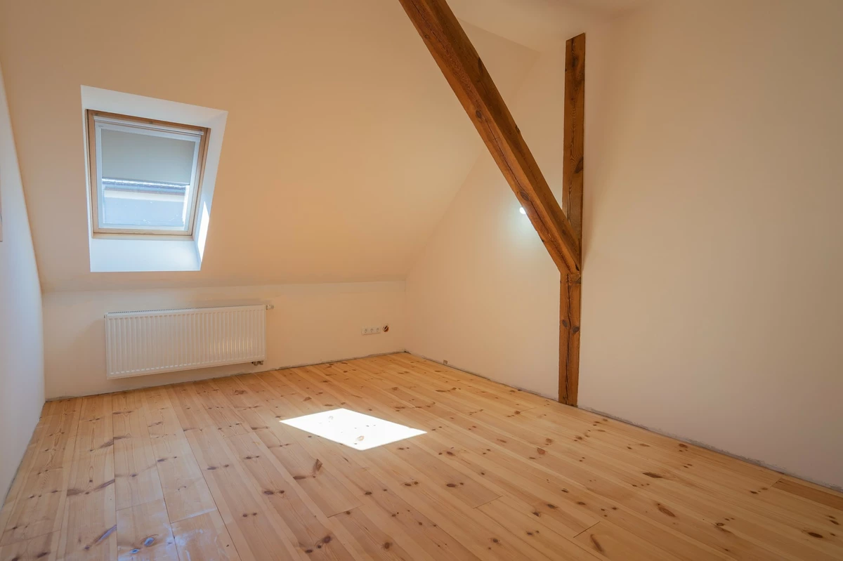 Um den Charakter eines Landhauses zu wahren, wurden mit Bedacht hochwertige Fliesen aus Spanien/Italien im Erdgeschoss und schwedische Kieferdielung im Dachgeschoss verlegt. In dieser Wohnung wurden energieeffiziente Heizschleifen in den Wänden verbaut; im Dachgeschoss finden sich Heizkörper.