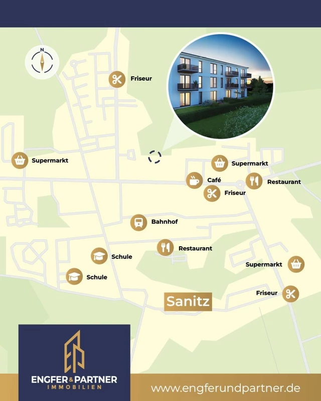 Kindergärten, einer Grundschule sowie weiterführenden Schulen in unmittelbarer Nähe. Dank des Bahnanschlusses und der schnellen Straßenverbindung über die B110 ist die Hansestadt Rostock in nur etwa 20 Minuten erreichbar. Freizeit beginnt direkt vor der Haustür: Radwege, Wälder und weite Felder laden zu Spaziergängen und sportlichen Aktivitäten ein. Wer das Meer liebt, erreicht die beliebten Ostseebäder Warnemünde, GraalMüritz oder Markgrafenheide schnell und unkompliziert. Sanitz bietet nicht nur eine hervorragende Lage, sondern auch ein lebendiges Umfeld mit Vereinen, Sportangeboten und regionalen Veranstaltungen. Gleichzeitig eröffnet die Nähe zu Rostock ein breites Angebot an Kultur, Shopping und Arbeitsplätzen. Sanitz ist mehr als ein Wohnort – es ist ein Ort, an dem man ankommt,